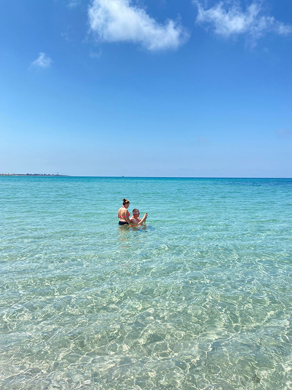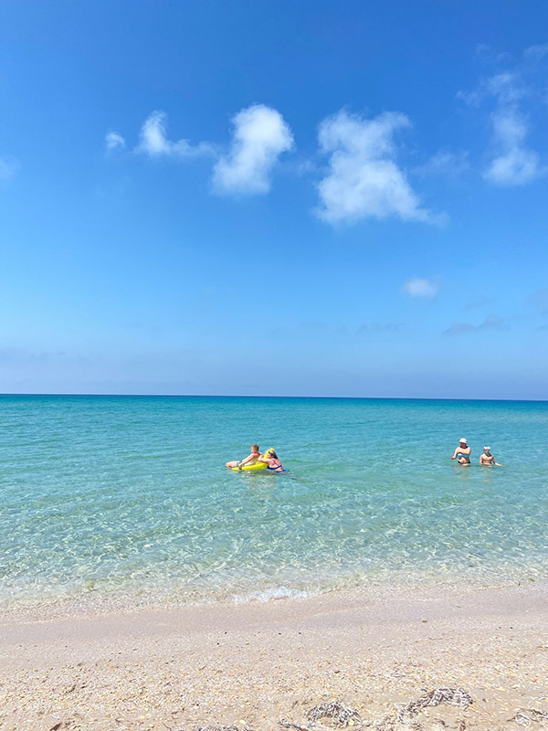 Такие невероятные оттенки здесь получаются благодаря белоснежному песку, который покрывает не только берег, но и дно моря.
