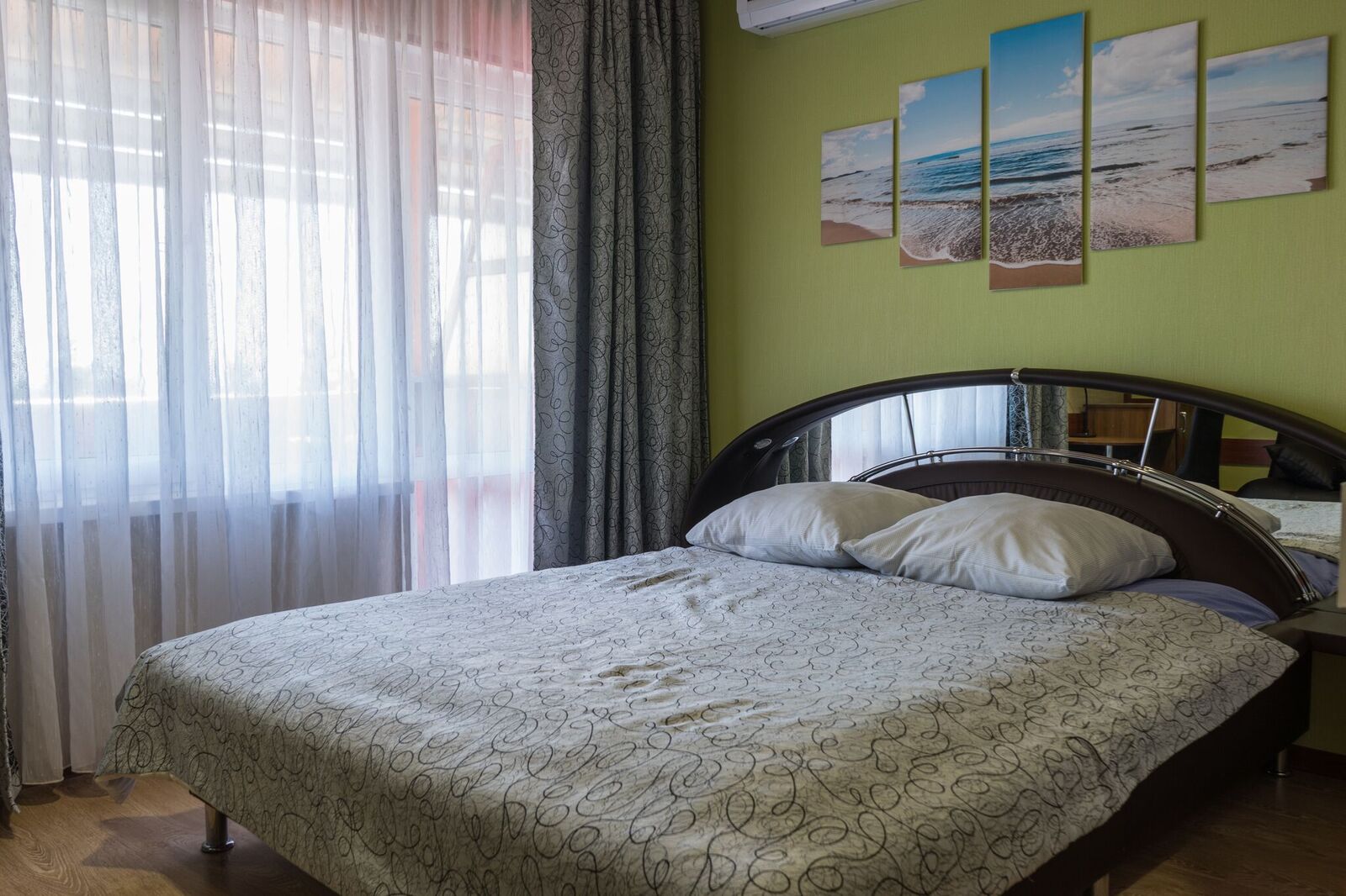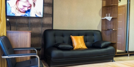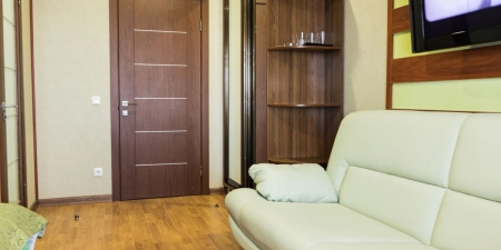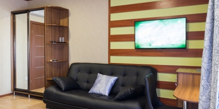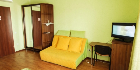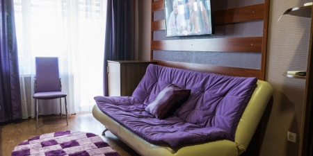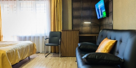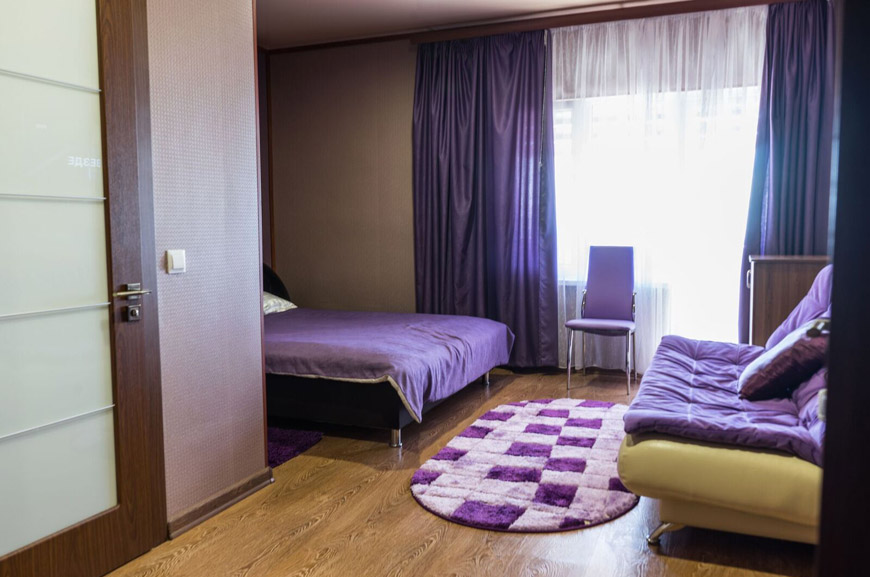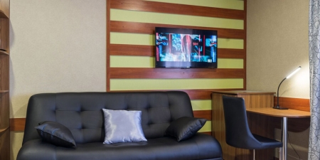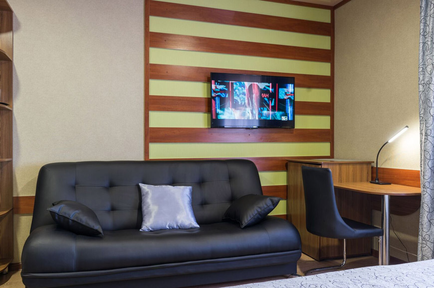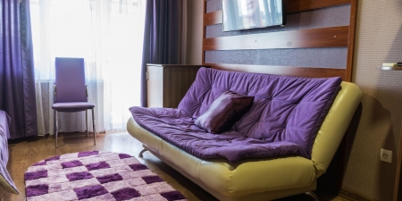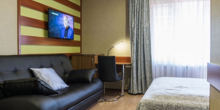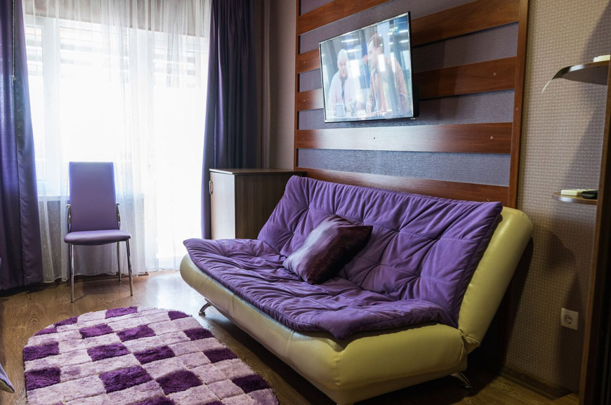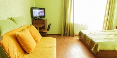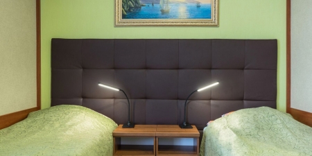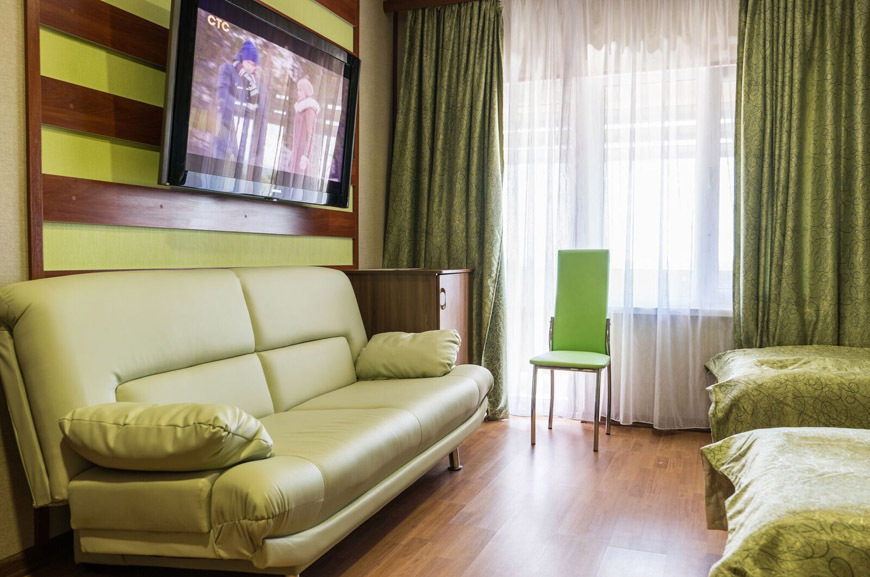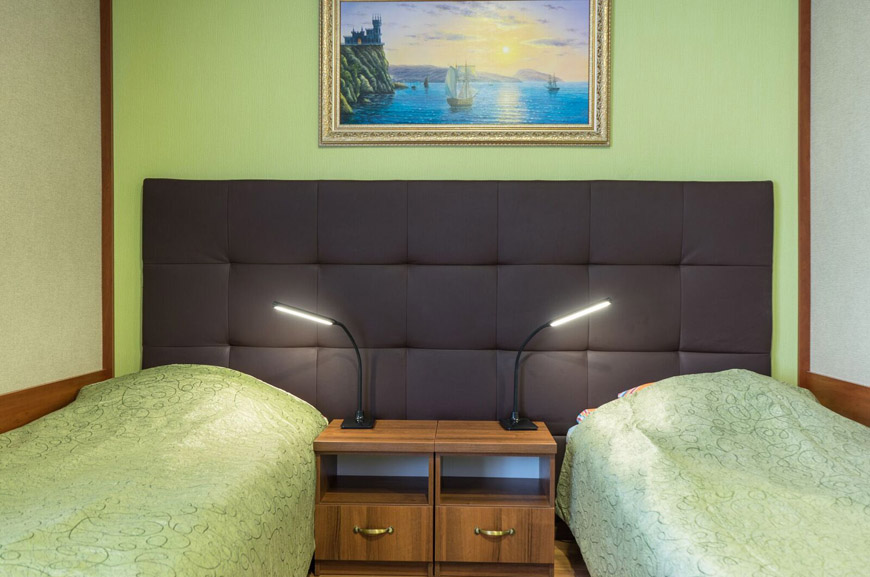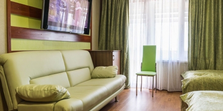 Трёхместные номера отличаются между собой цветовой гаммой — выбирайте тот, который нравится вам! В каждой комнате красивый текстиль, удобная мебель.