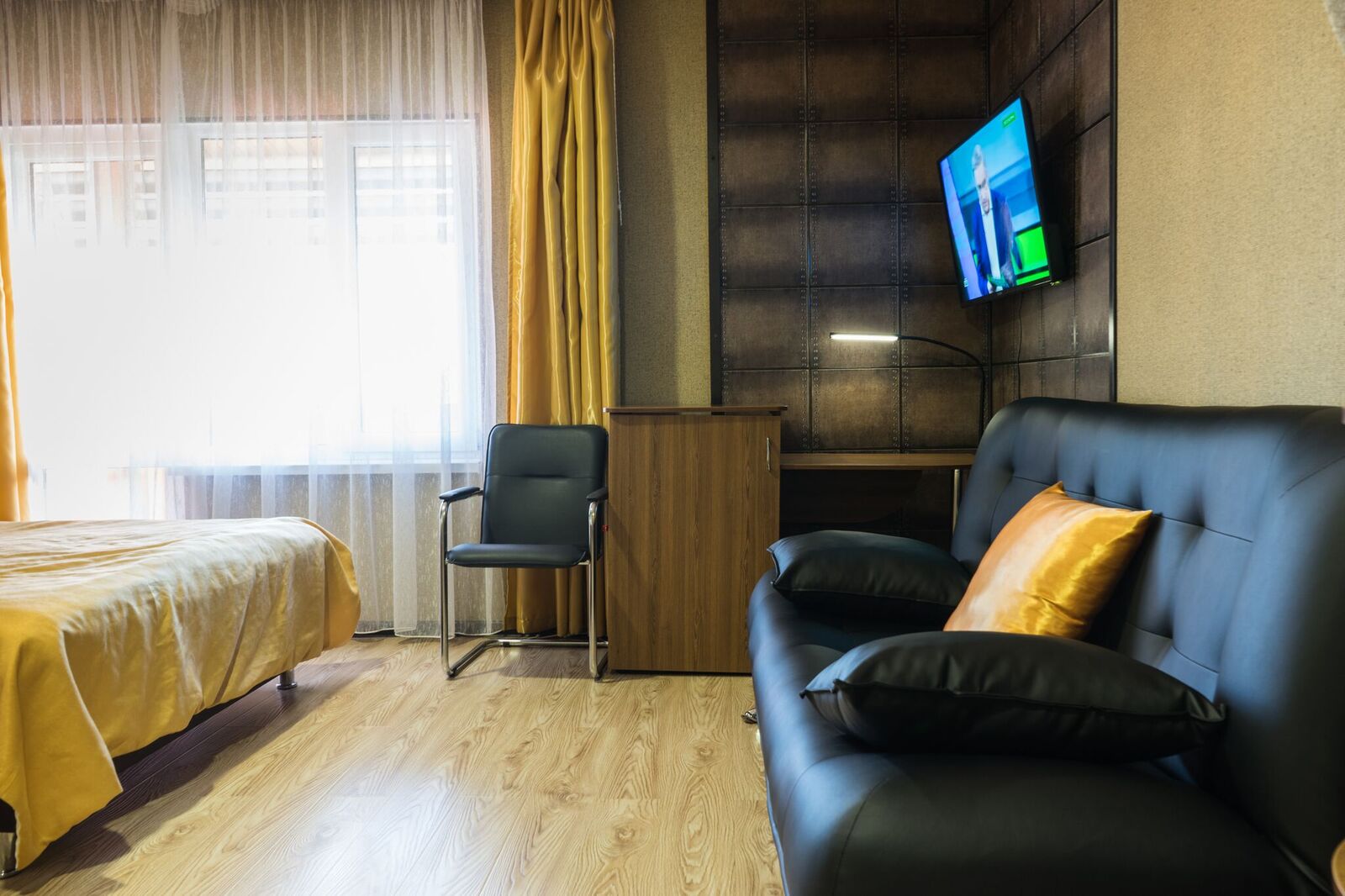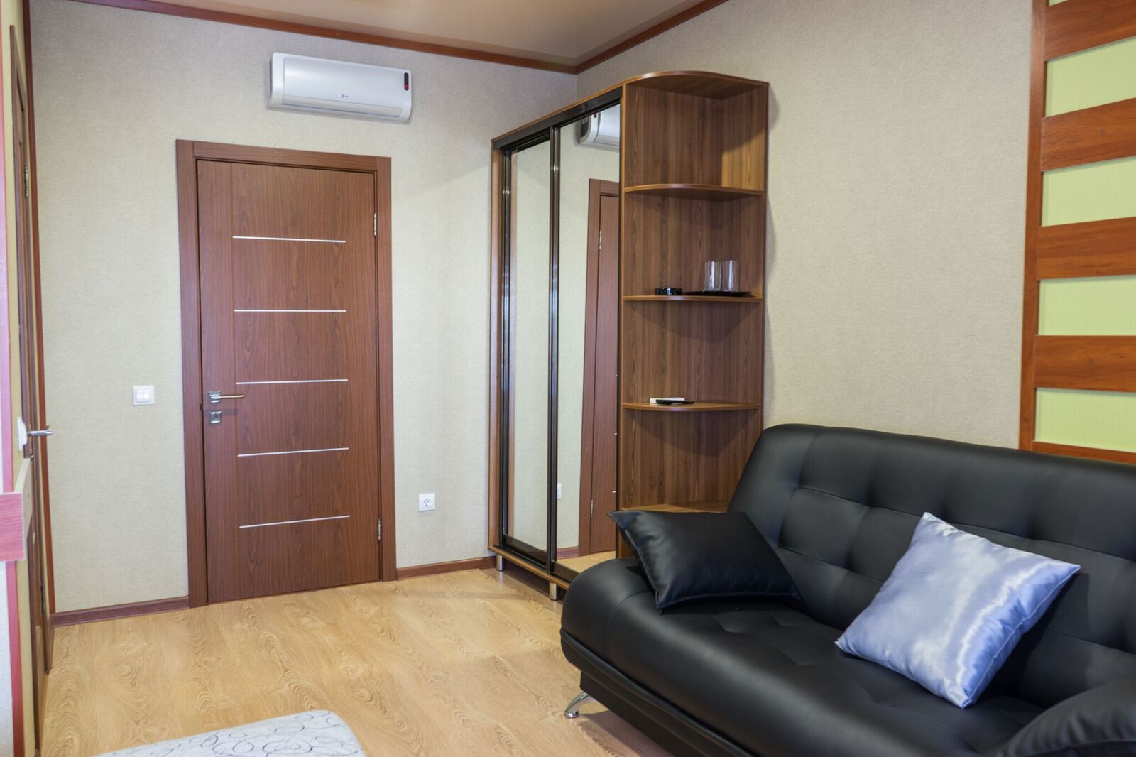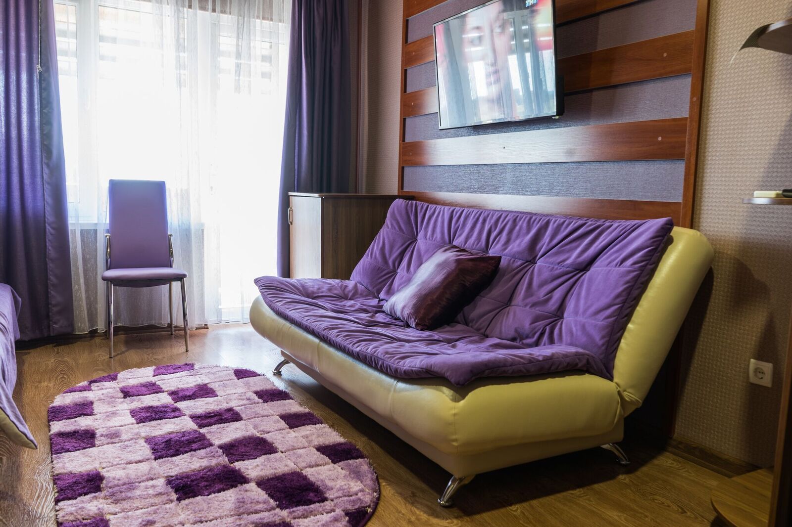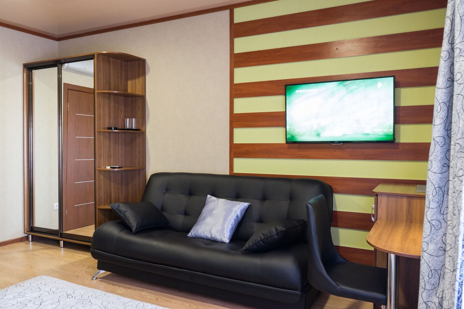 Трёхместные номера отличаются между собой цветовой гаммой — выбирайте тот, который нравится вам! В каждой комнате красивый текстиль, удобная мебель.